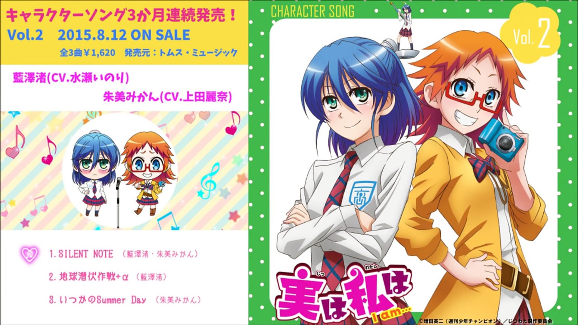 Tvアニメ「実は私は」キャラクターソング vol2 藍澤渚(cv水瀬いのり)、朱美みかん(cv上田麗奈)15年8月12日(水)発売♡ トラックリスト01 silent朱美みかん(上田麗奈)の「いつかのSummerDay」歌詞ページです。作詞橋本彩子,作曲奥井康介。実は私は イメージソング (歌いだし)いつかのSummer Day思い出では 歌ネットは無料の歌詞検索サービ実は私はがイラスト付きでわかる! 週刊少年チャンピオンにて連載された増田英二による漫画作品。15年7月にはテレビアニメも放映された。 『可愛いあの娘は吸血鬼!?』。 概要 高校生の黒峰朝陽を中心に巻き起こる人外娘ラブコメディ。 タイトルのように誰かヒロインが登場したかと